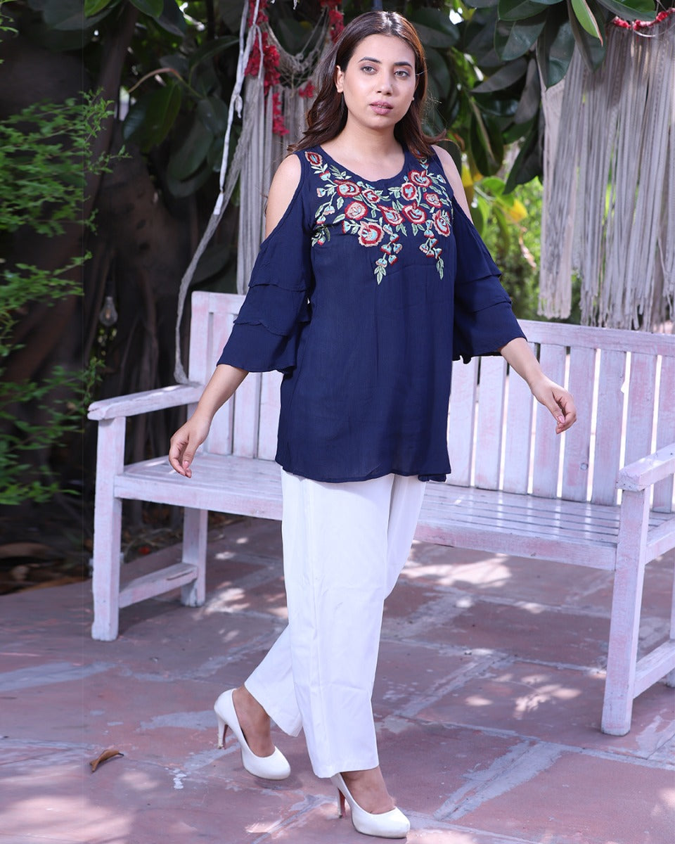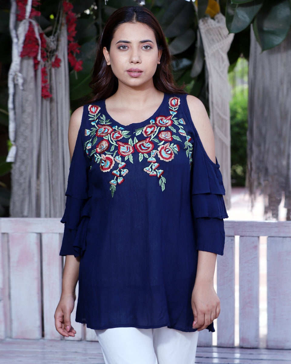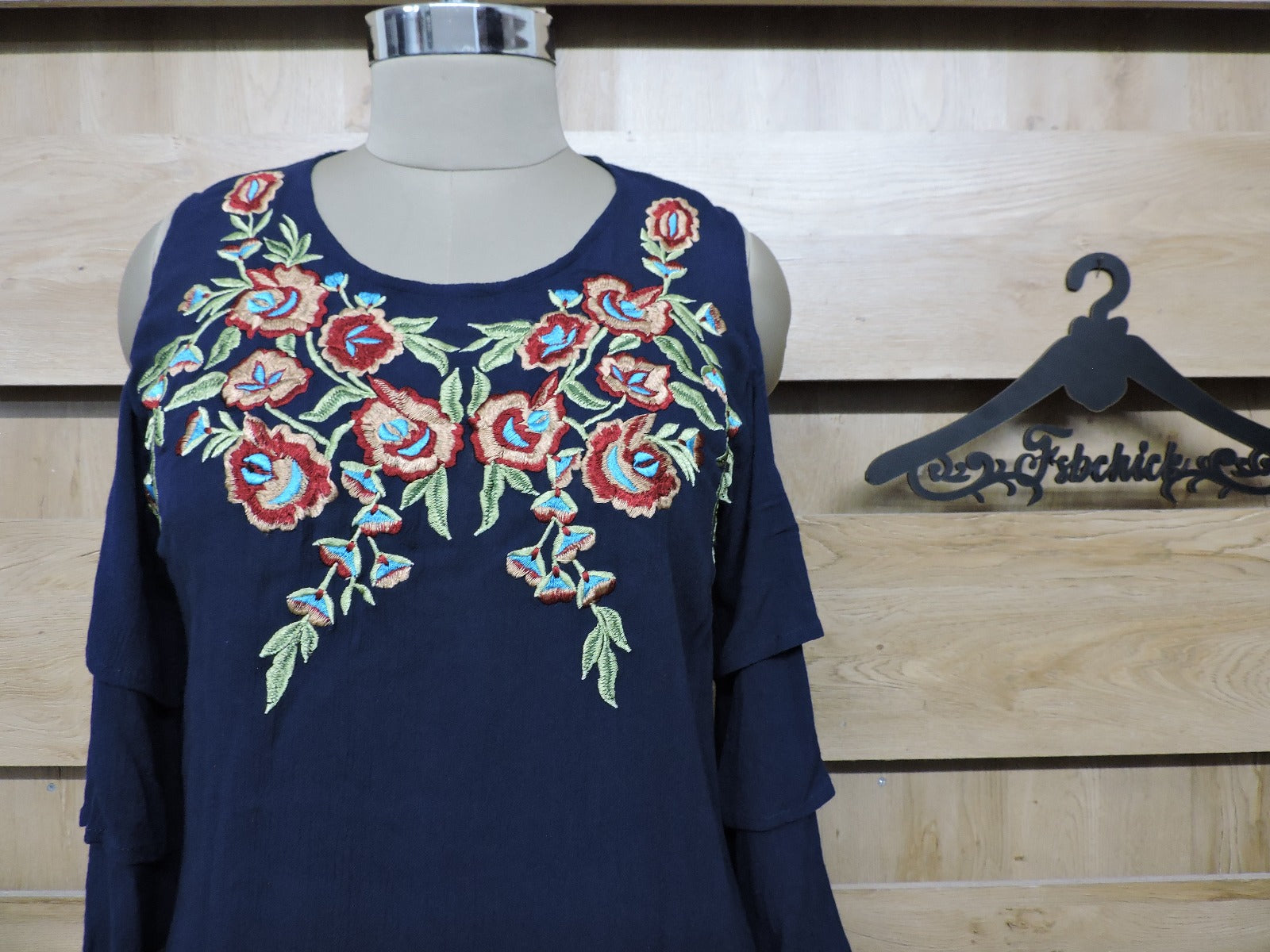 Lightweight cold shoulder top by FSBCHICK with beautiful embroidered detail. Also it has three layered sleeves