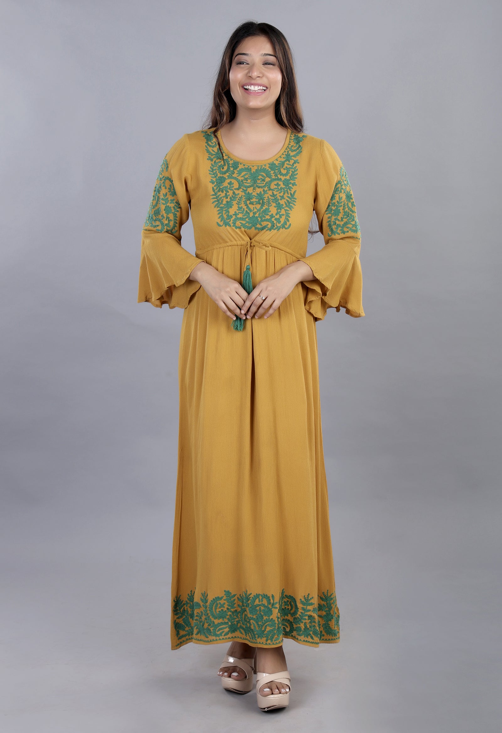 • Mustard Fine Thread Embroidered Dress- It’s take the right color to pick to uplift the complete look. This mustard dress with green embroidery over it exhibits brightness yet subtleness. The long pattern looks fabulous when worn to beach vacations, or usual shopping outings.