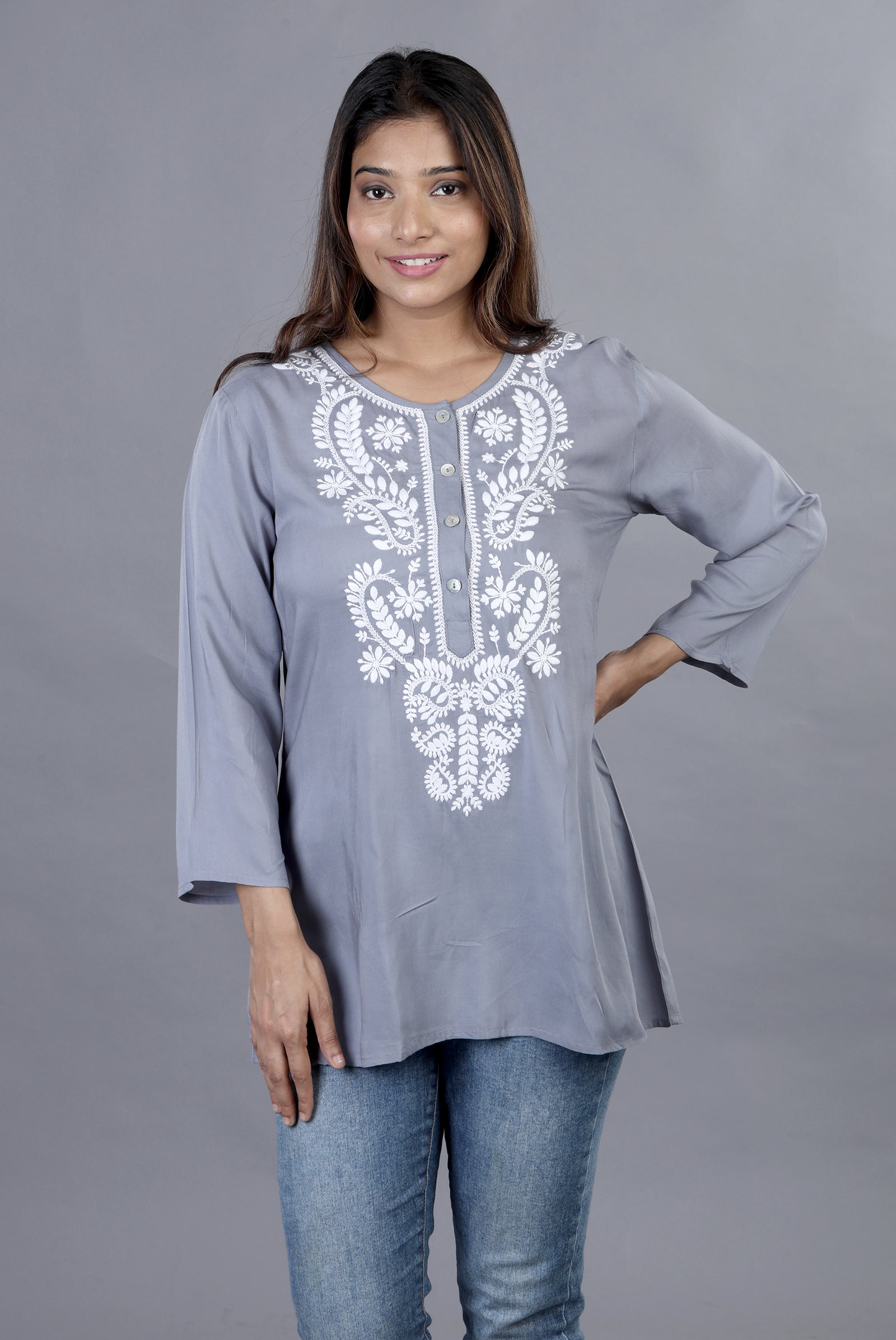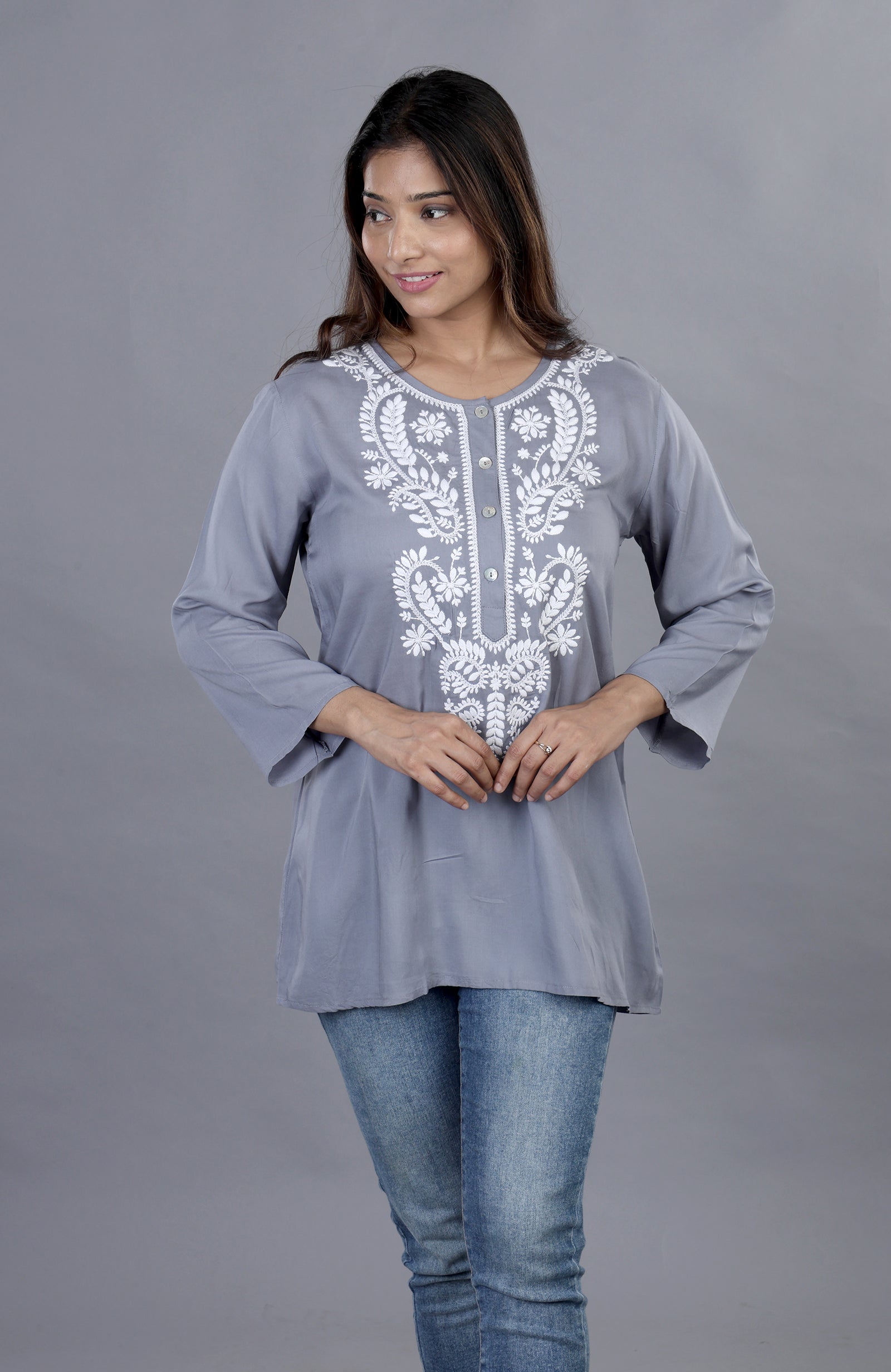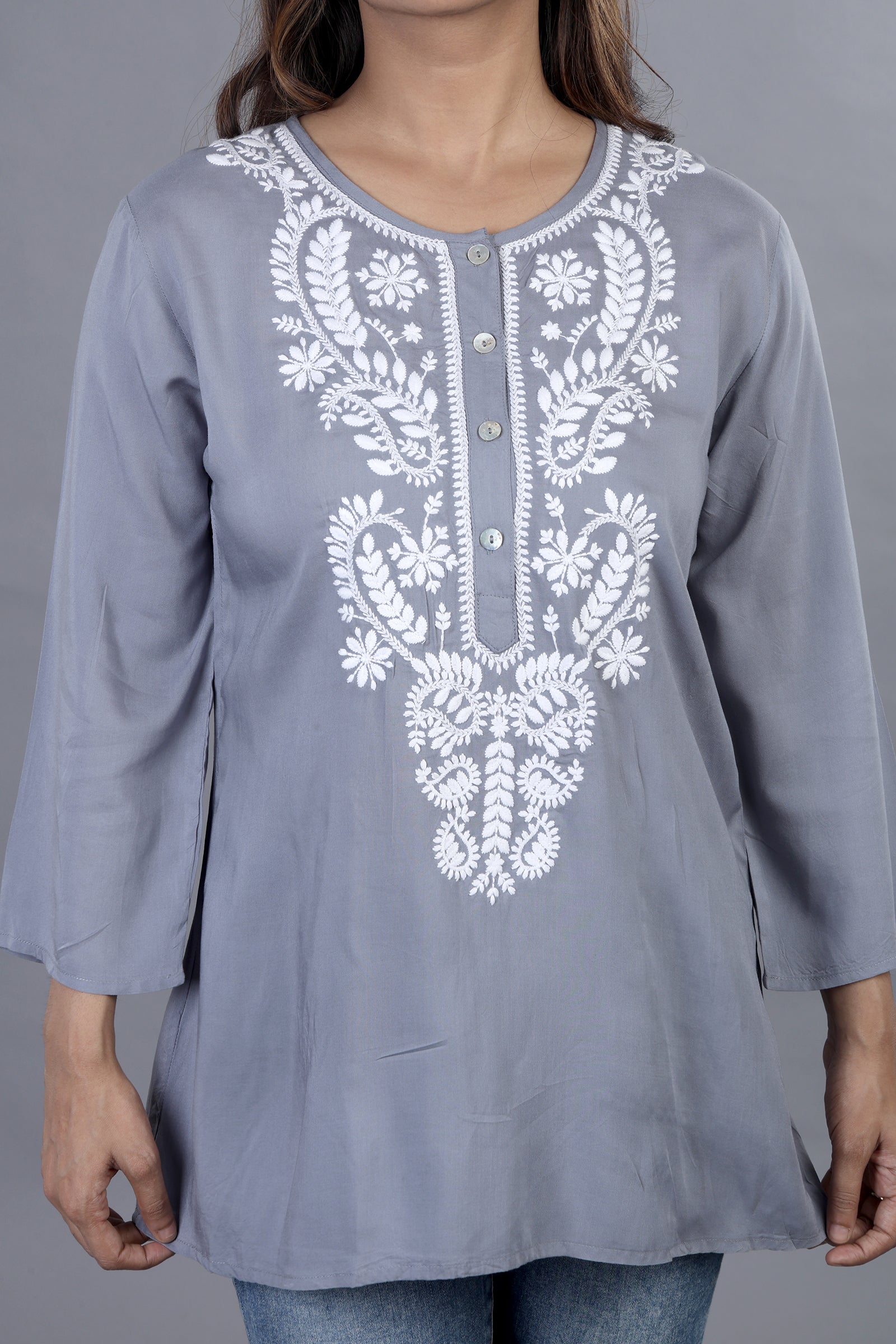 Grey Fine Embroidered Top- Getting something classy yet simple to wear is not easy. This grey top with fine white embroidery all over looks surreal. You can choose to wear it for Formal and Informal look both.