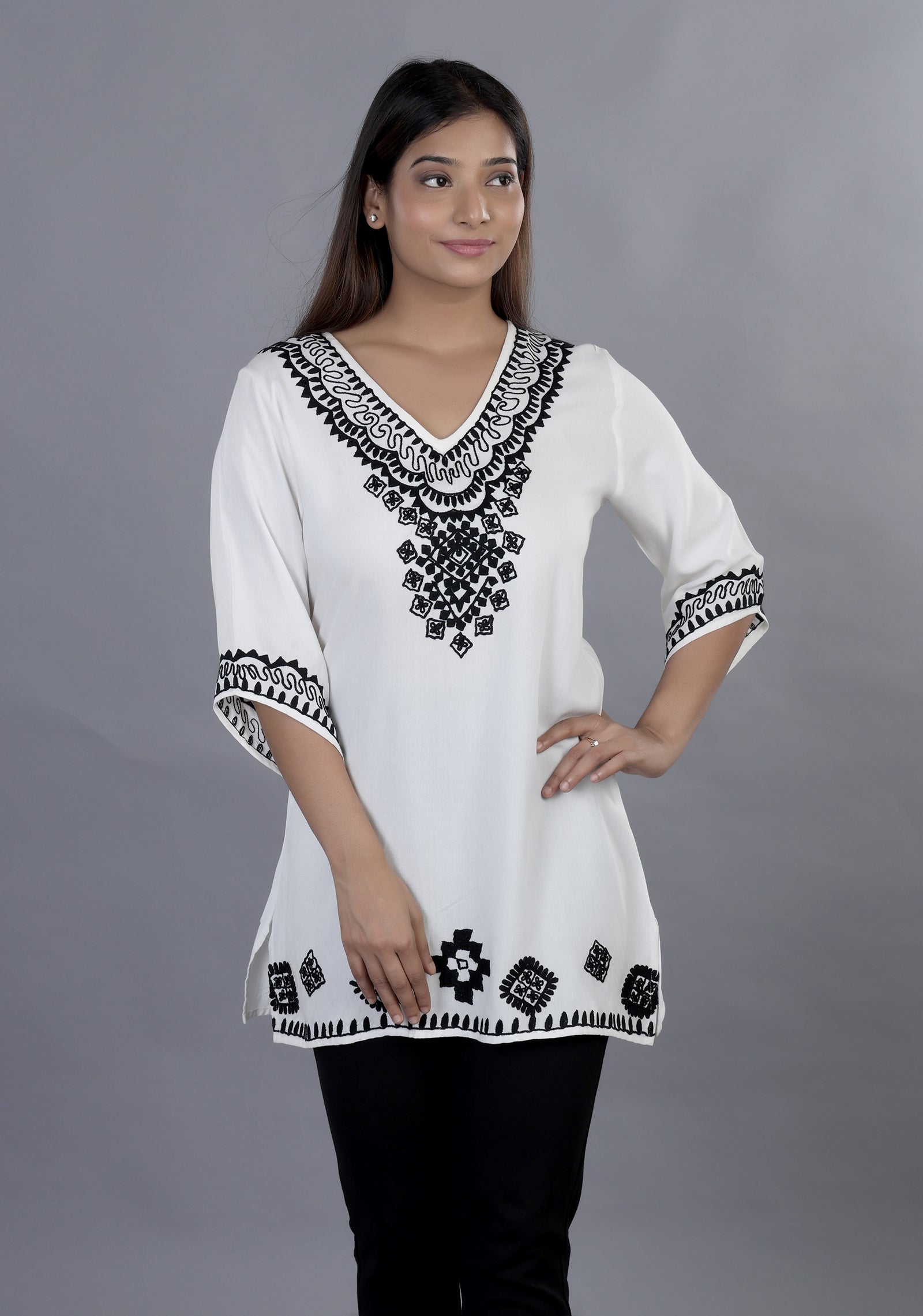 • White Embroidered Tunic- Confused about what to wear in summers? Choose White over anything else. This White tunic with traditional thread embroidery all over looks amazingly good.  The Broad V neck helps hiding your flaws effortlessly.