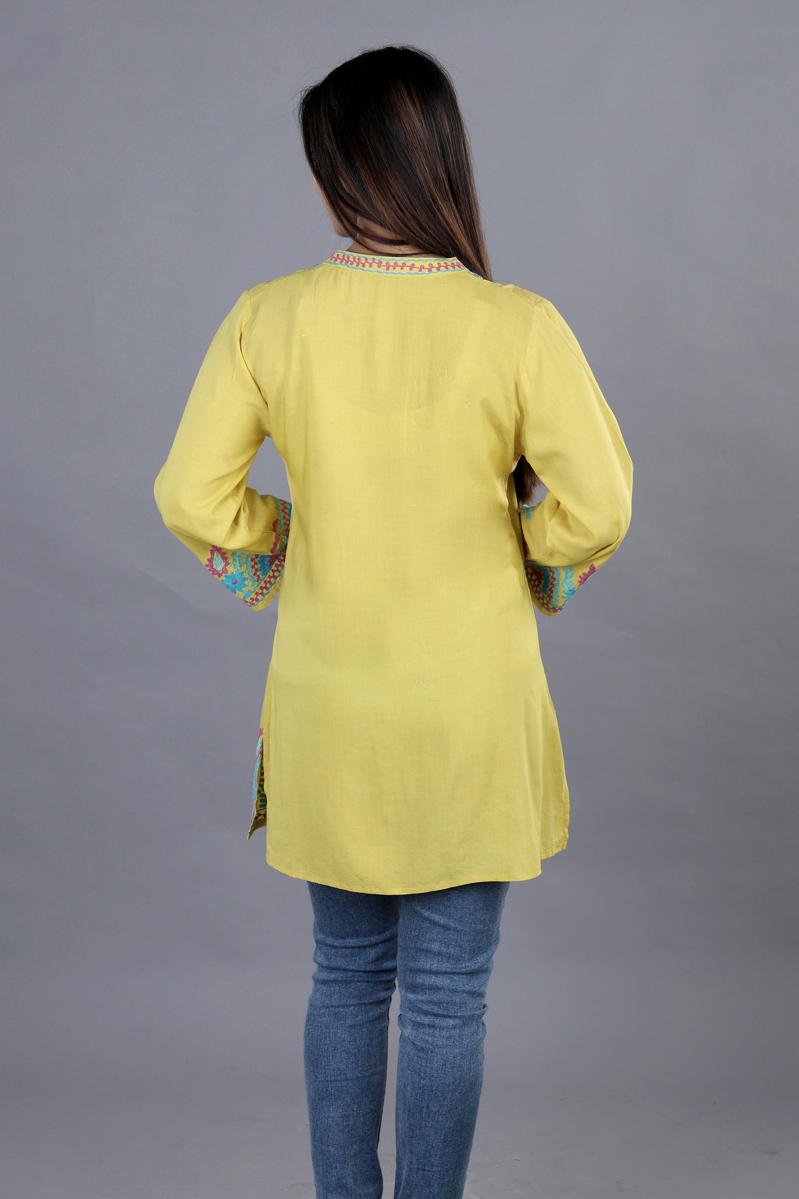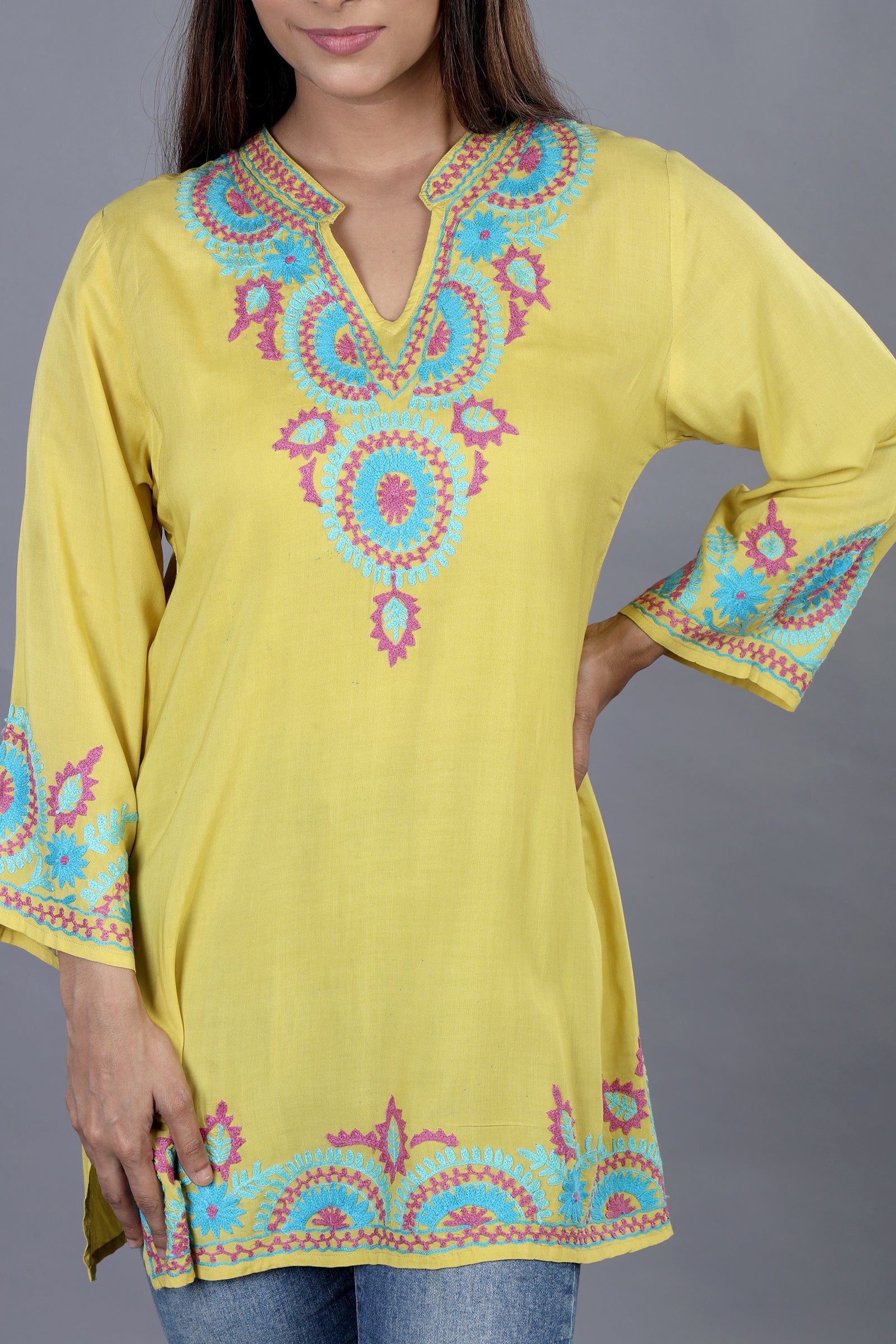 • Yellow Embroidered Tunic- Perplexed about what to wear in office? Choose colors like Yellow, Green to shine bright and glow. This Yellow tunic with subtle thread embroidery in the front, bottom on the sleeves looks amazingly good.  The half V neck helps hiding your flaws effortlessly.