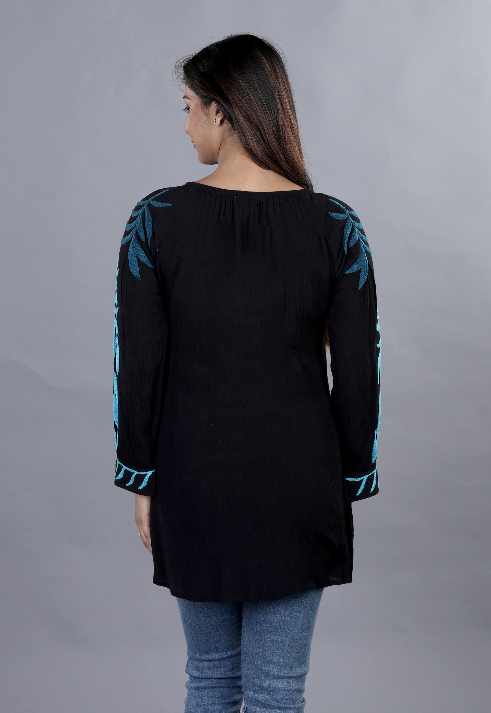 Tunic is your go to piece if you prefer comfort over anything else. This black tunic with full embroidery pattern looks unique. The 100% rayon fabric feels smooth on the skin with no rash even in summers. You can carry it in your office, work from home meetings, and long journeys. The minimal green thread embroidery gives a traditional taste with a fusion of modernization. Carry it with black trouser for an appealing look.