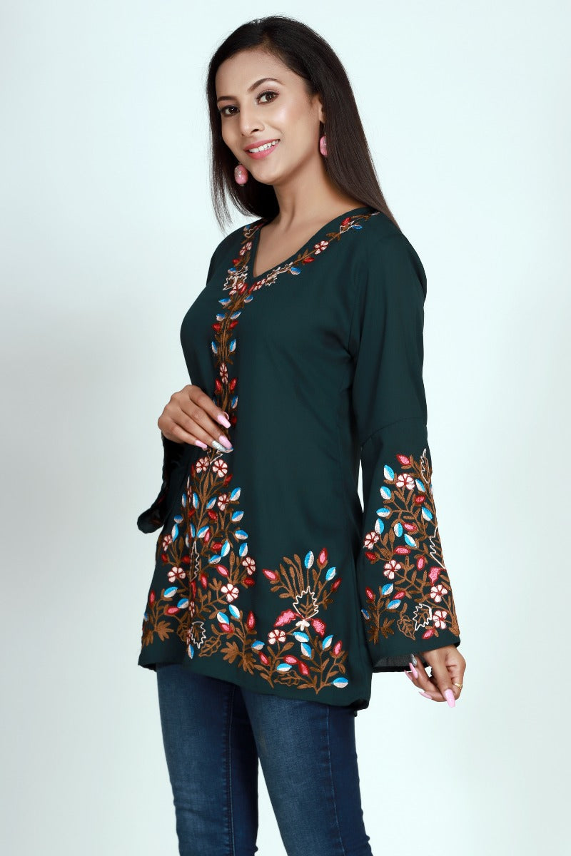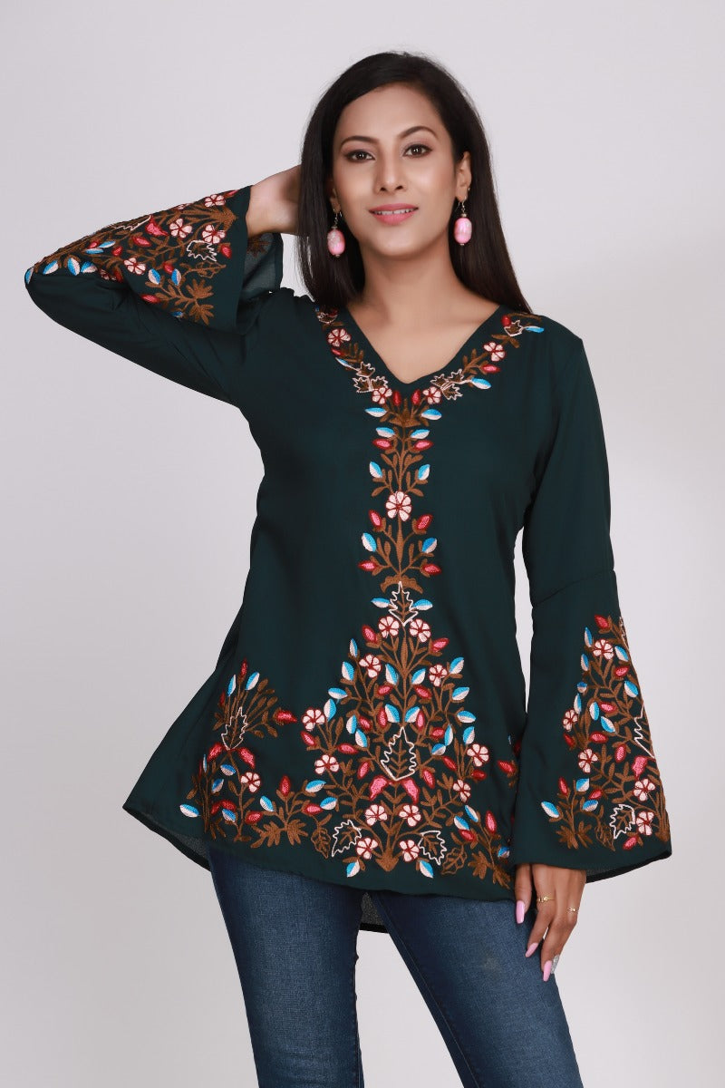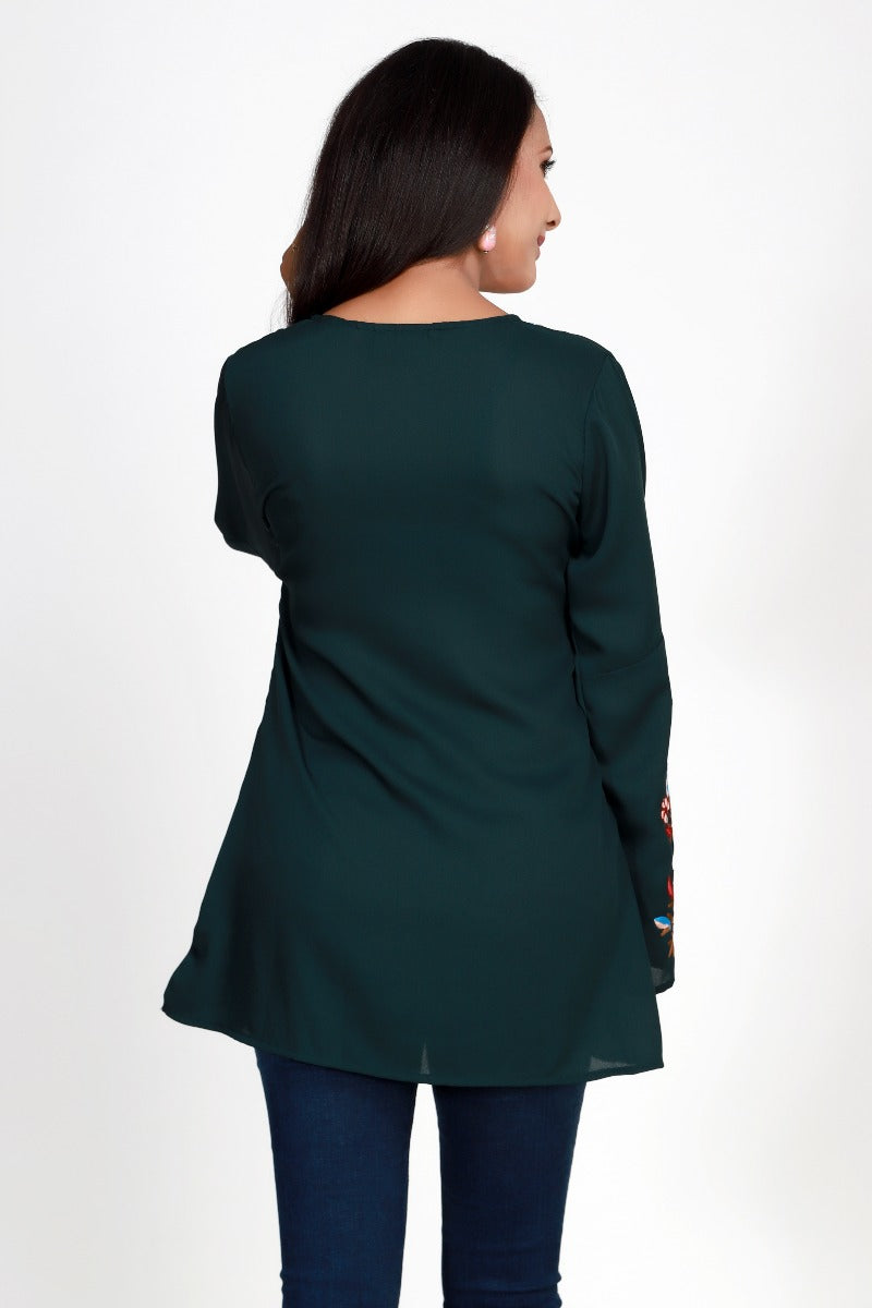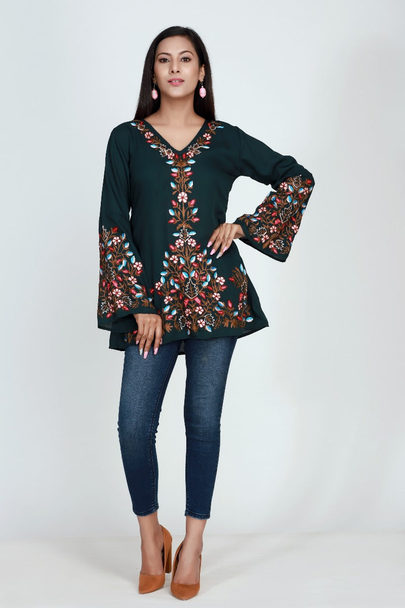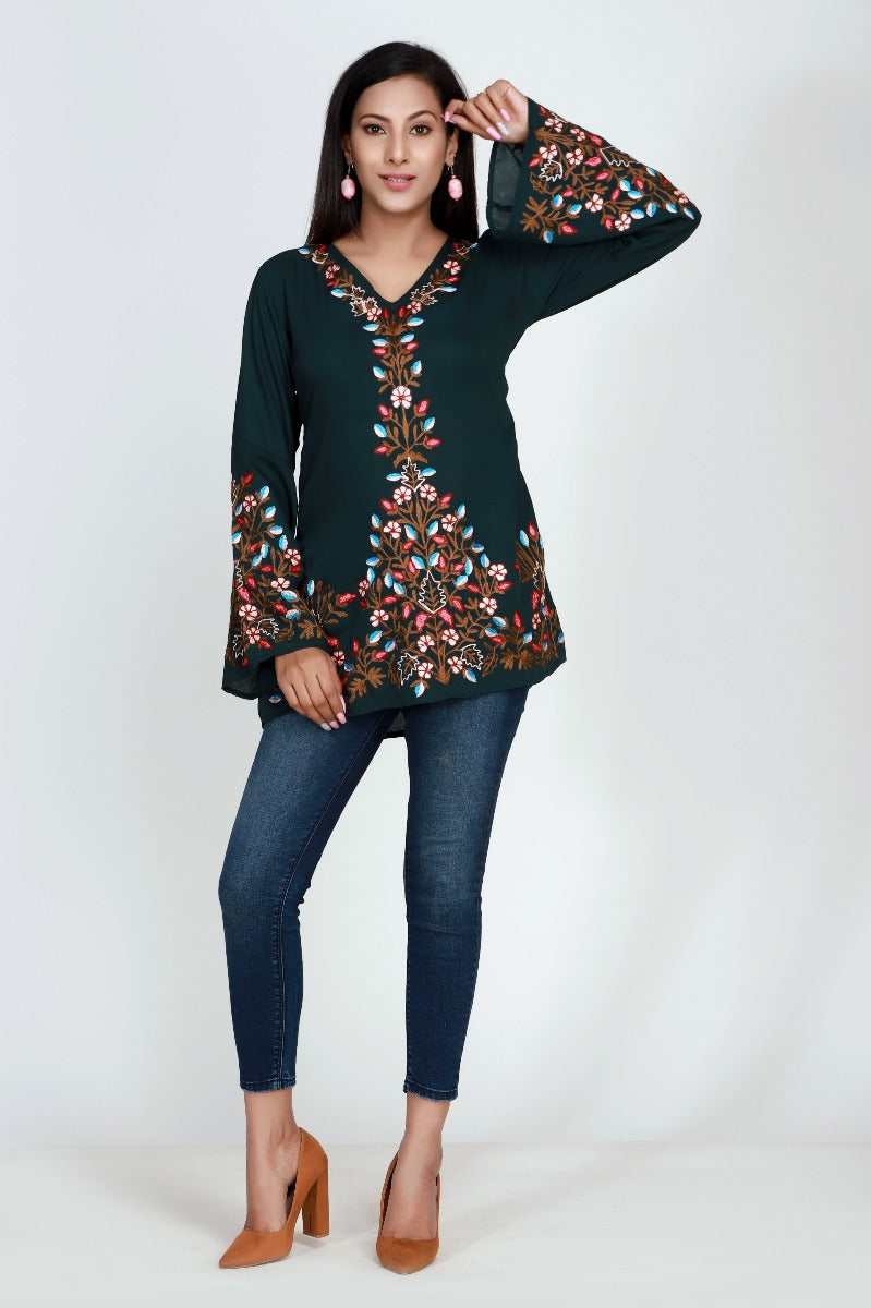 An absolute winner LET THE LOVE BLOOM has a relaxed fit. Embroidery around the neck, till the bottom and sleeves. This pretty and feminine tunic can be worn over your favorite leggings, jeans, shorts Flattering V neckline and gently elasticated long bell sleeves. LENGTH 31 INCHES