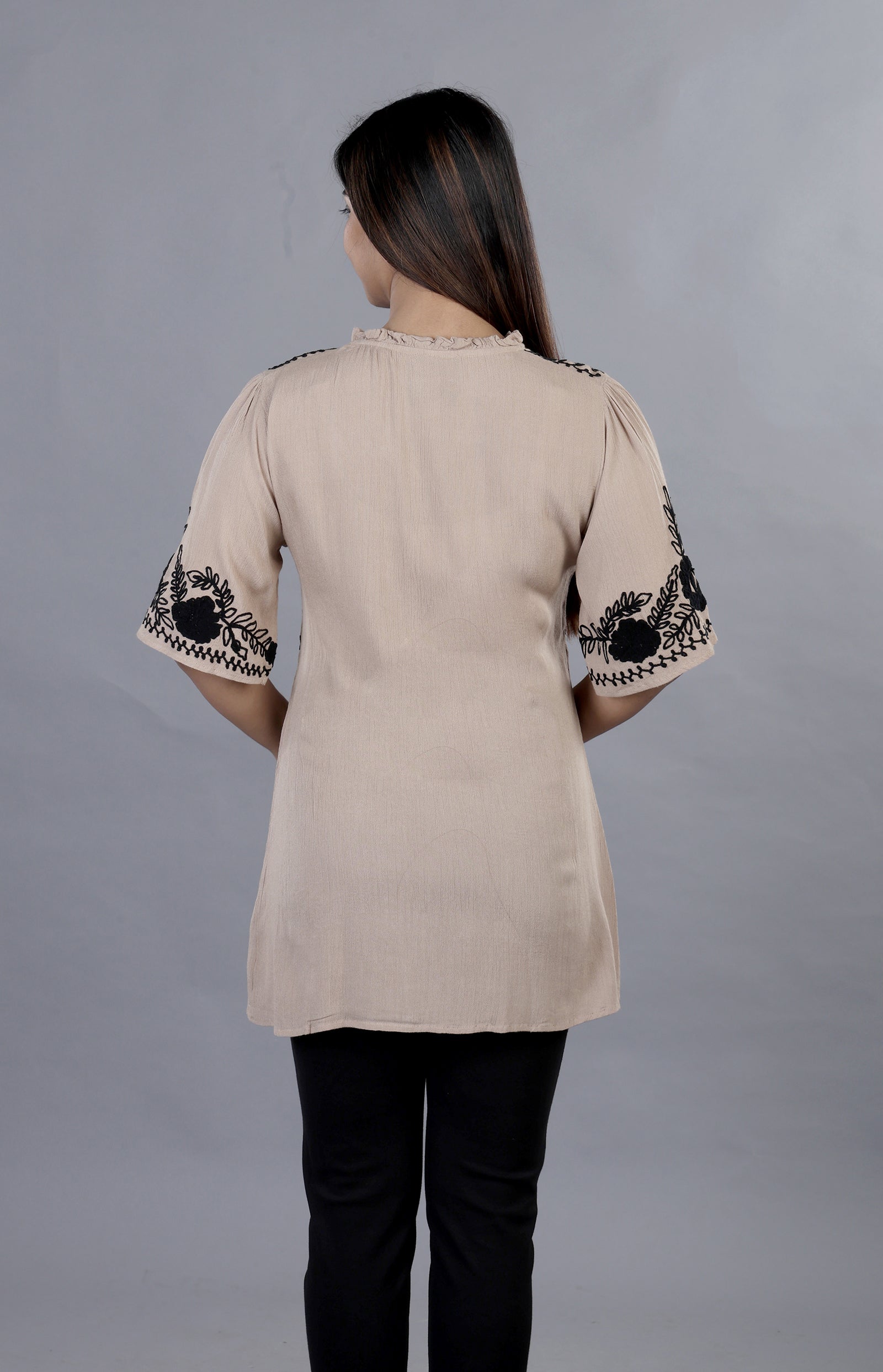 •  Black Thread Embroidered Fawn Fusion Tunic- Take a dip in the hues of fawn with this simple yet elegant tunic. The puffed style neck with half V neck looks best if you have a pear shaped or apple shaped body.