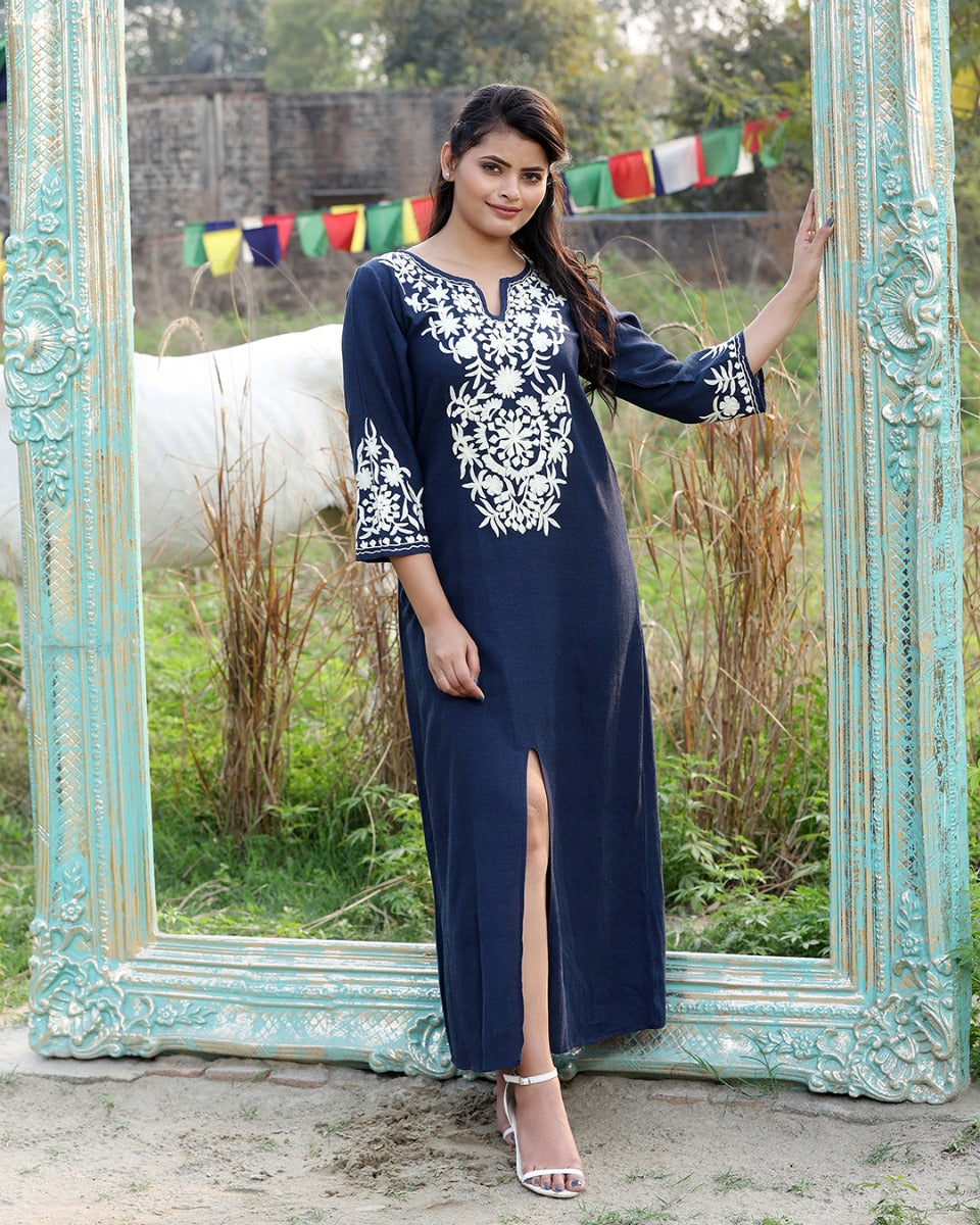 The amalgamation of classiness yet tradition is what this piece shows us. The front slit adds grace and modernity to your look. Giving bohemian vibes, this quirky outfit is what you should add in your beach vacation collection. The full-sleeved pattern is well thought-off and the colour is strong and hence barely fades away.The elastic at the back cinches the waist.