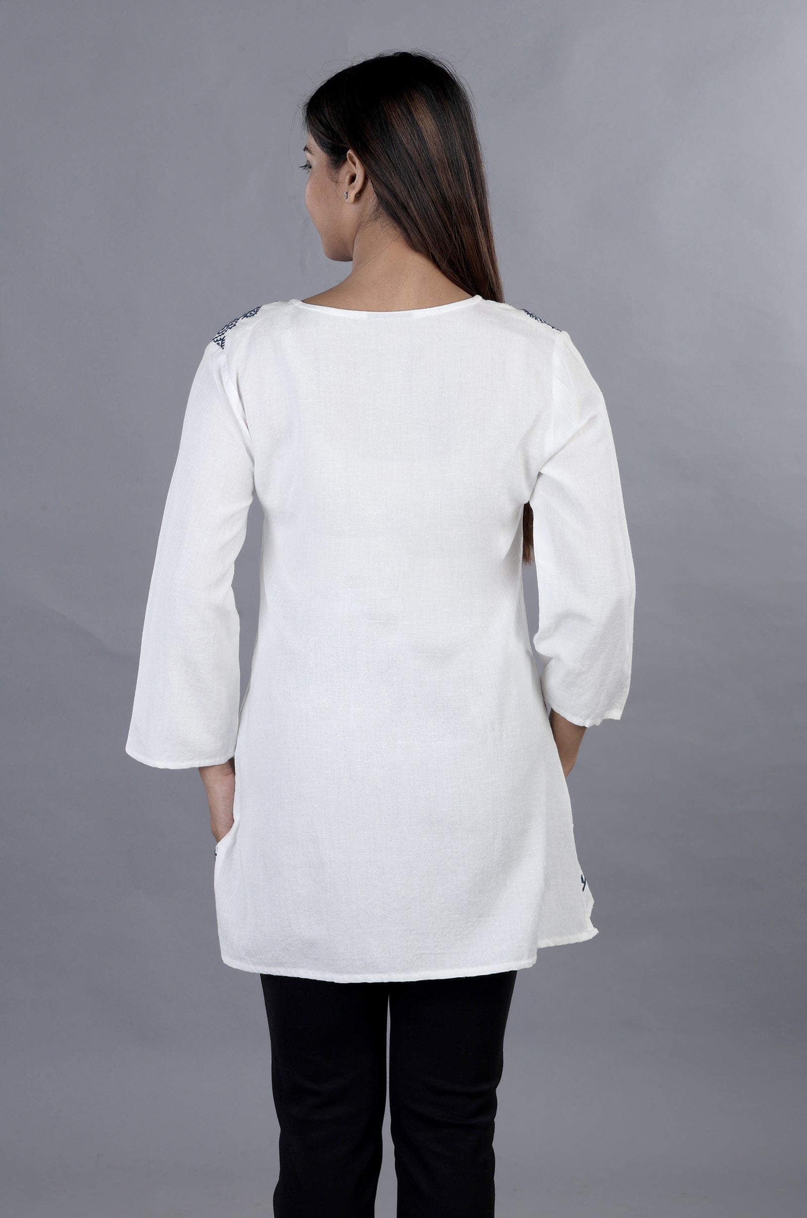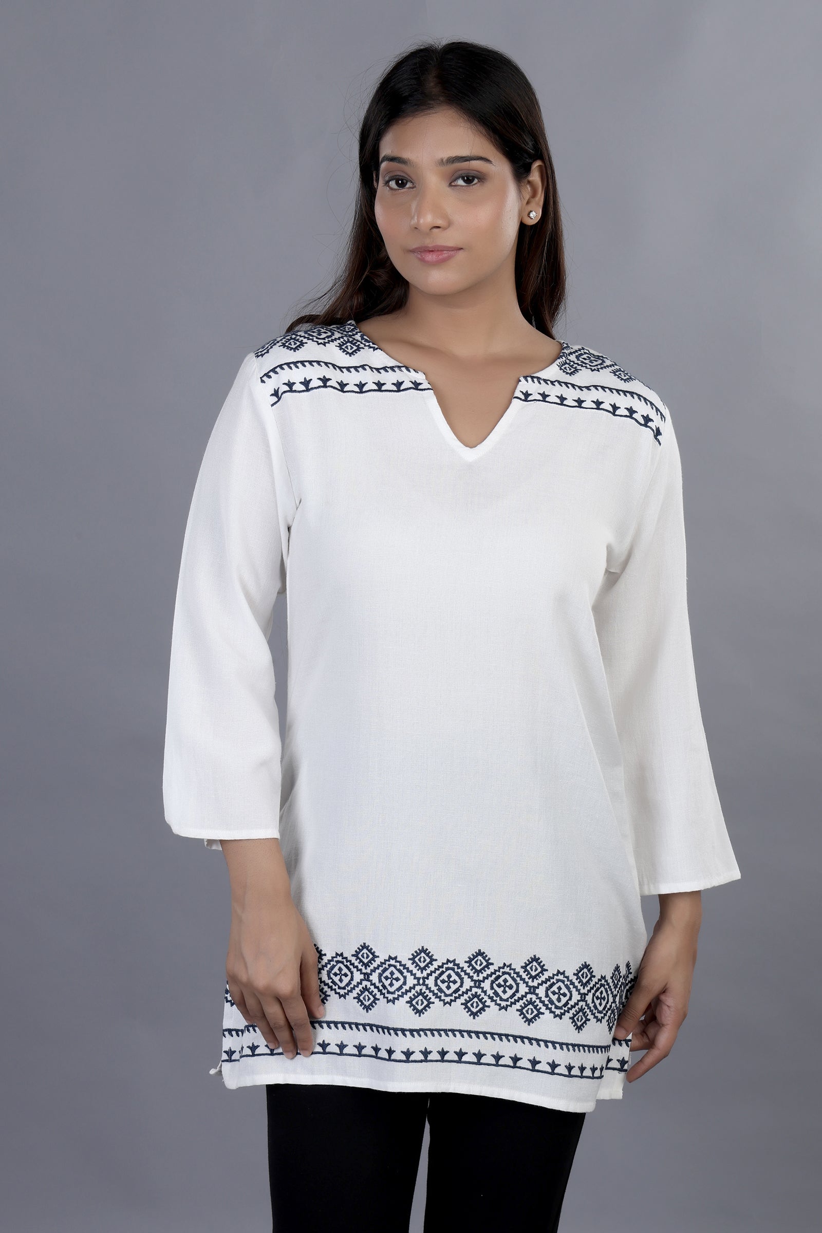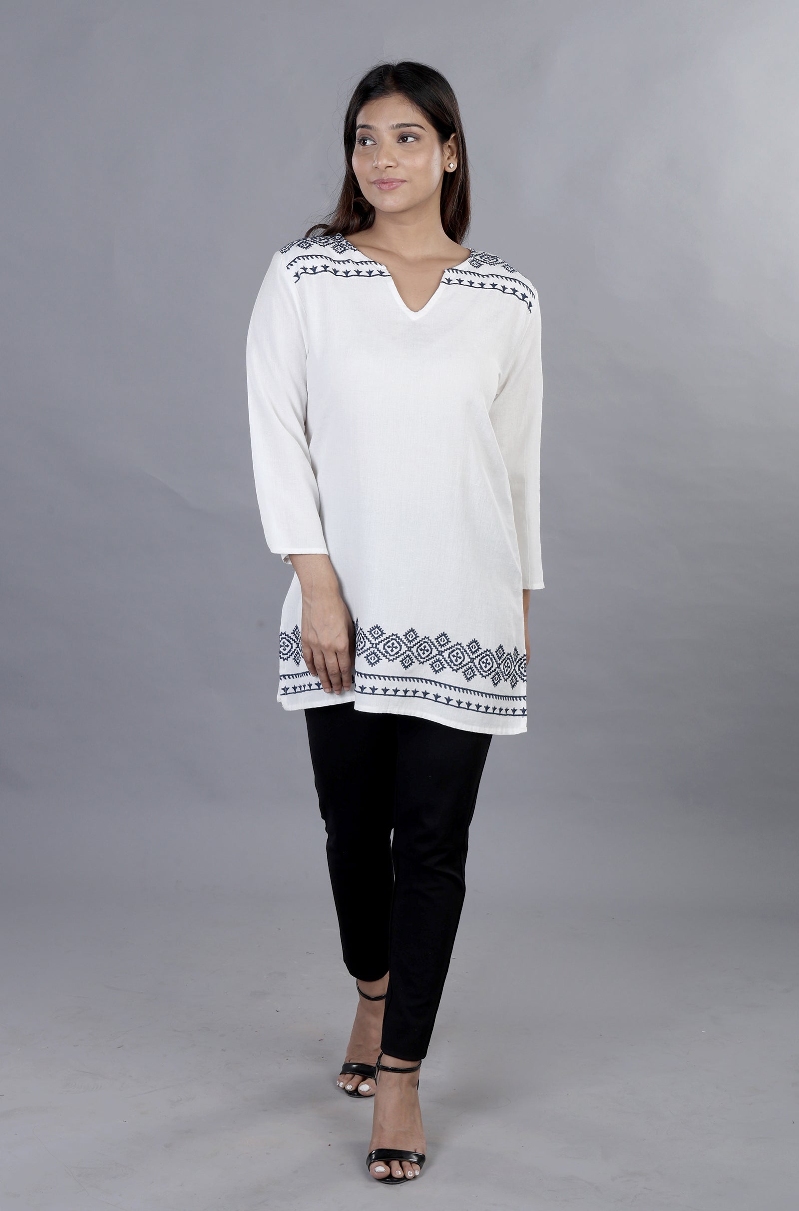 • White Fine Embroiderd Tunic- No color can be as perfect for summers as white. This beautiful white Tunic with black embroidery on it feels so fresh and unique. The embroidery is subtle and is perfect to carry to office or on causal outings.