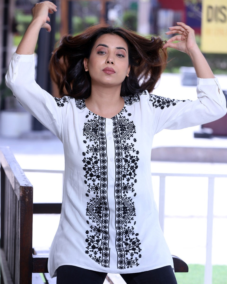 Delicately sewn floral details blossom across our OCEAN’SDREAM TOP to create a bouquet of stunning spring-perfect designs. Small, embroidered details trace around the sleeves. Dress it up with bold statement jewelry and skinny jeans or pair with casual joggers or shorts for a chic, on-trend look.