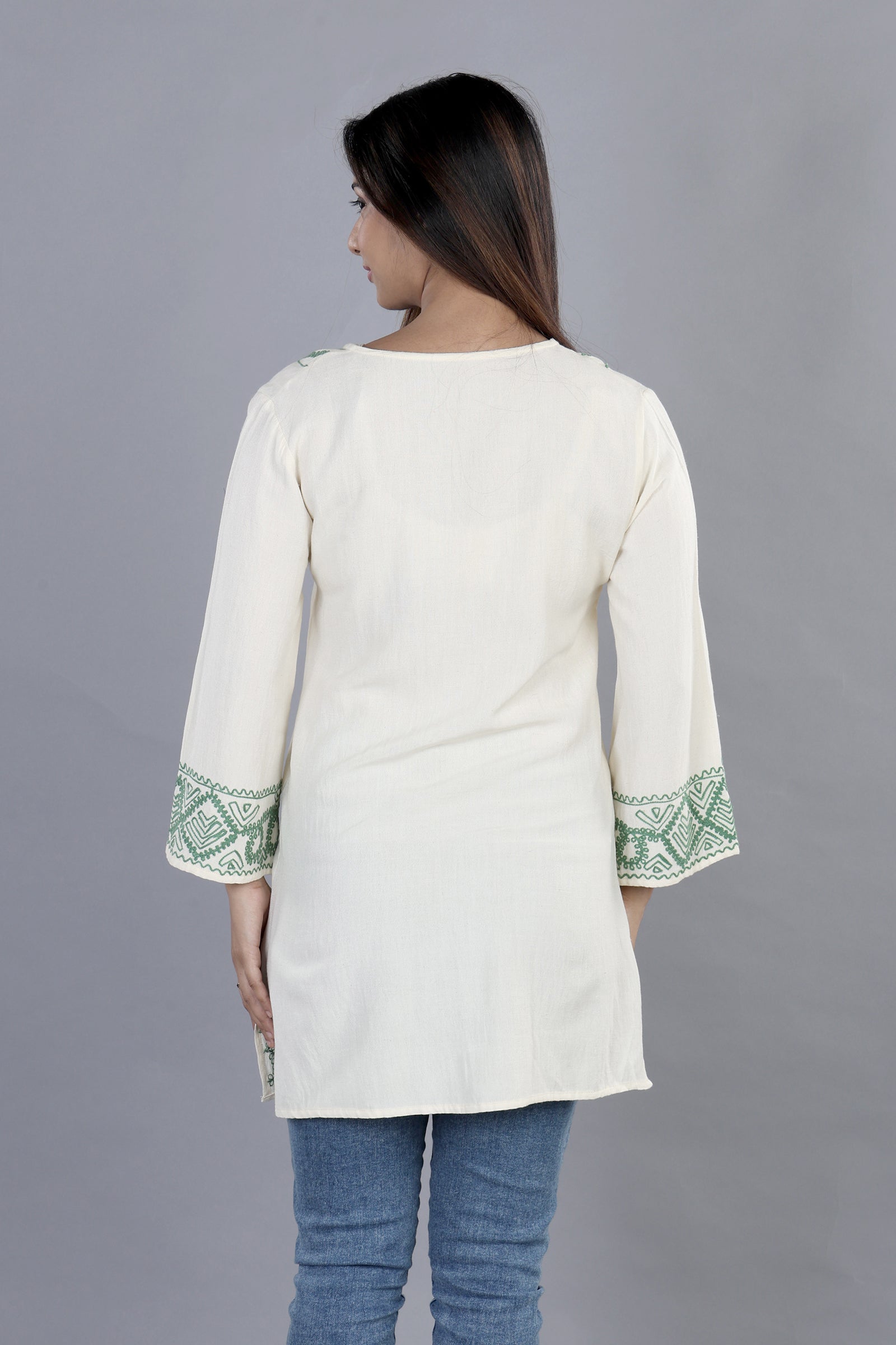 •  Off White Embroidered Tunic- Confused about what to wear in summers? Choose White over anything else. This White tunic with traditional thread embroidery all over looks amazingly good.  The Broad V neck helps hiding your flaws effortlessly.