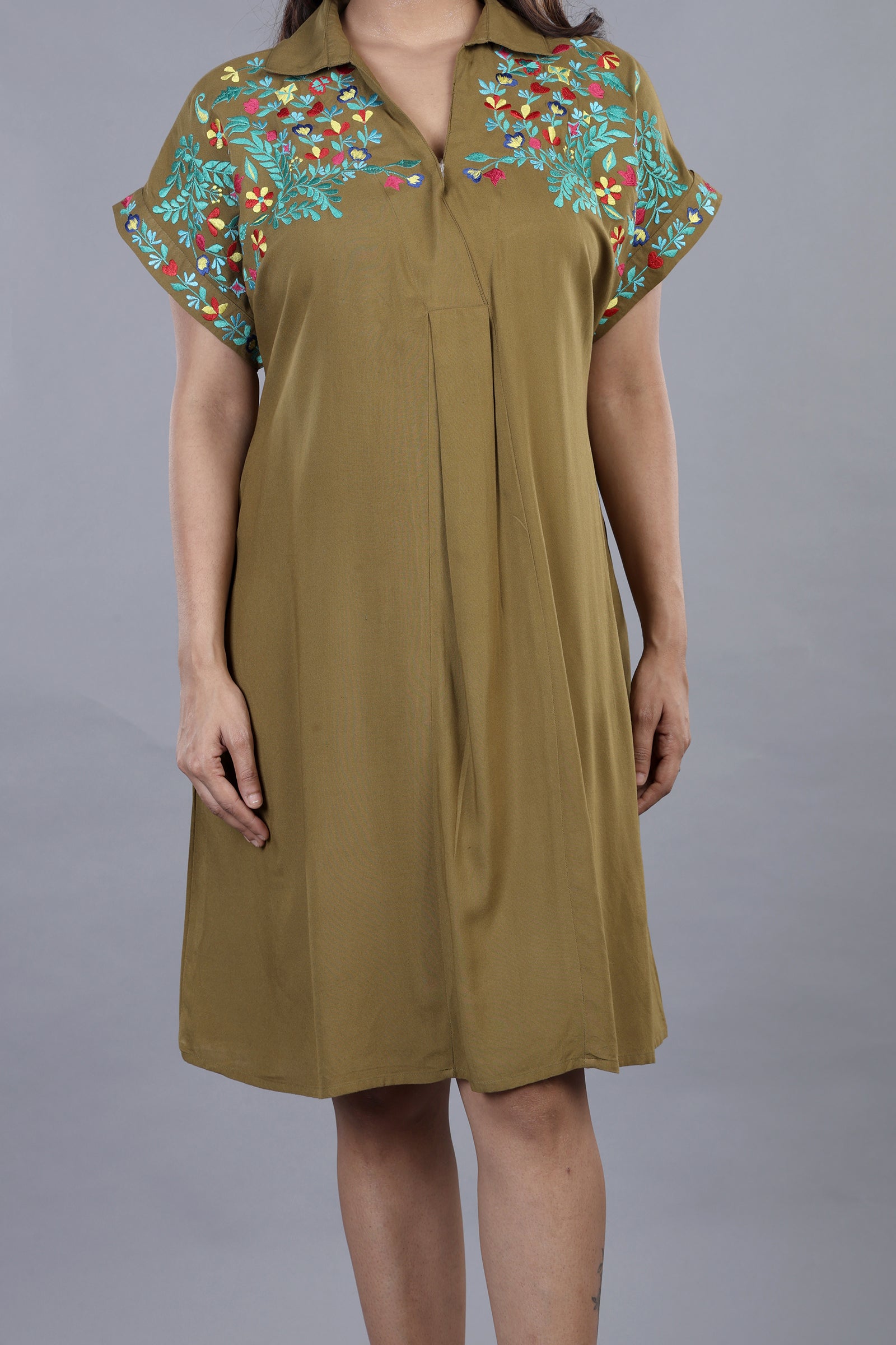 You cannot define some colors, but those colors define your personality. Mehndi color is one of them. This beautiful Mehndi dress is one of its kind. You can carry it with confidence and race without thinking twice. The fabric is 100% Rayon and is preferably hand wash. Available in all sizes, the dress can be worn to casual outings, long journeys, romantic date and work from home scenes. The minimal thread embroidery further adds grace it , making it a piece of elegance.