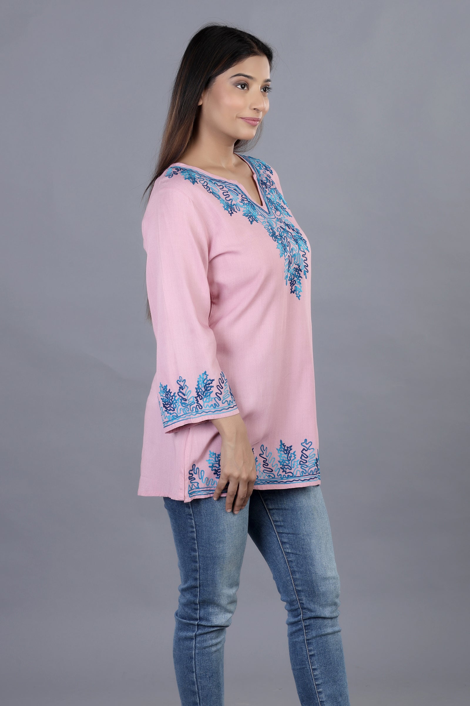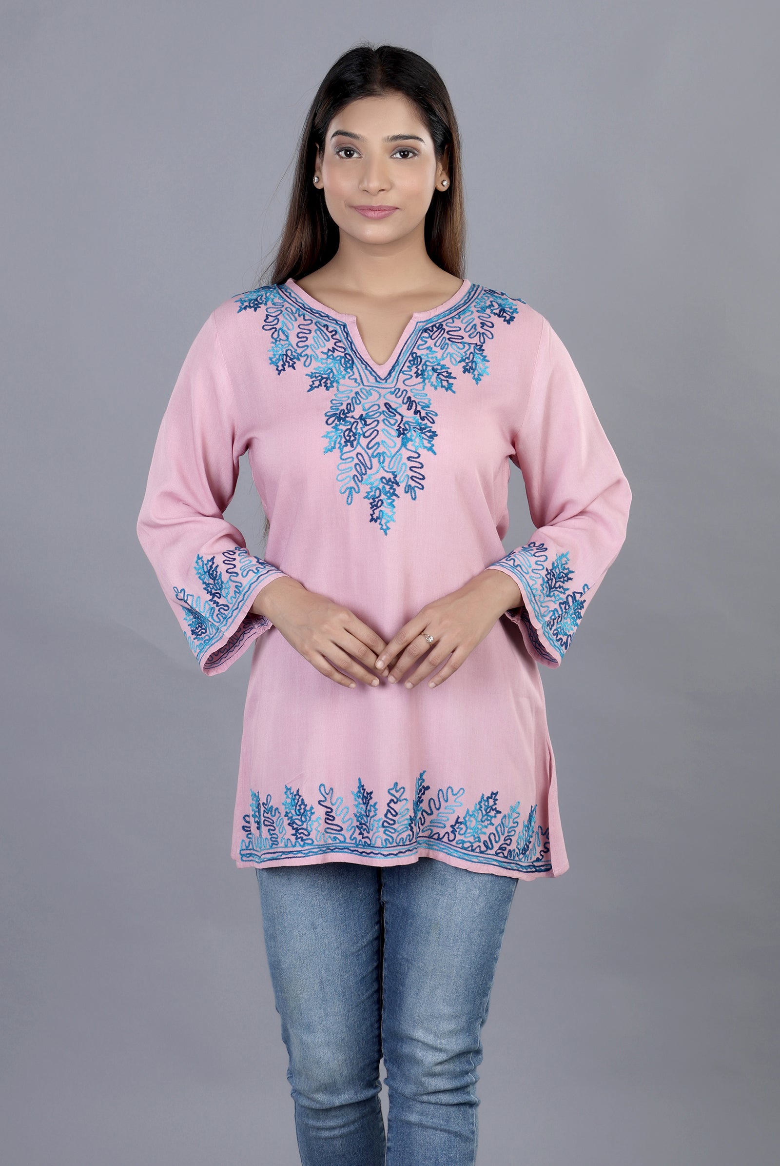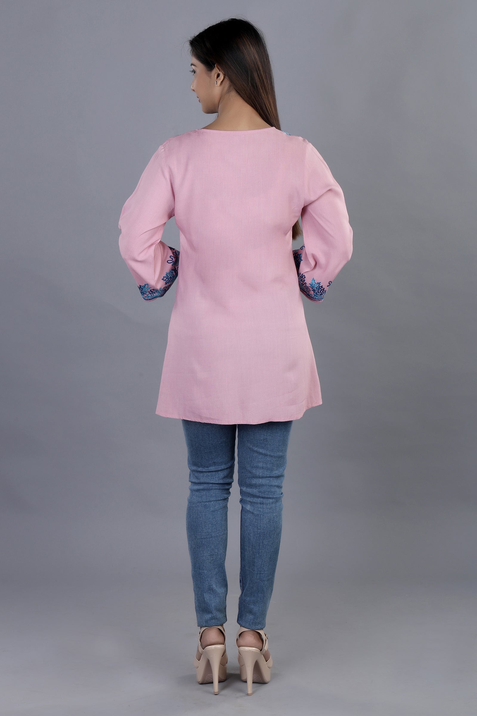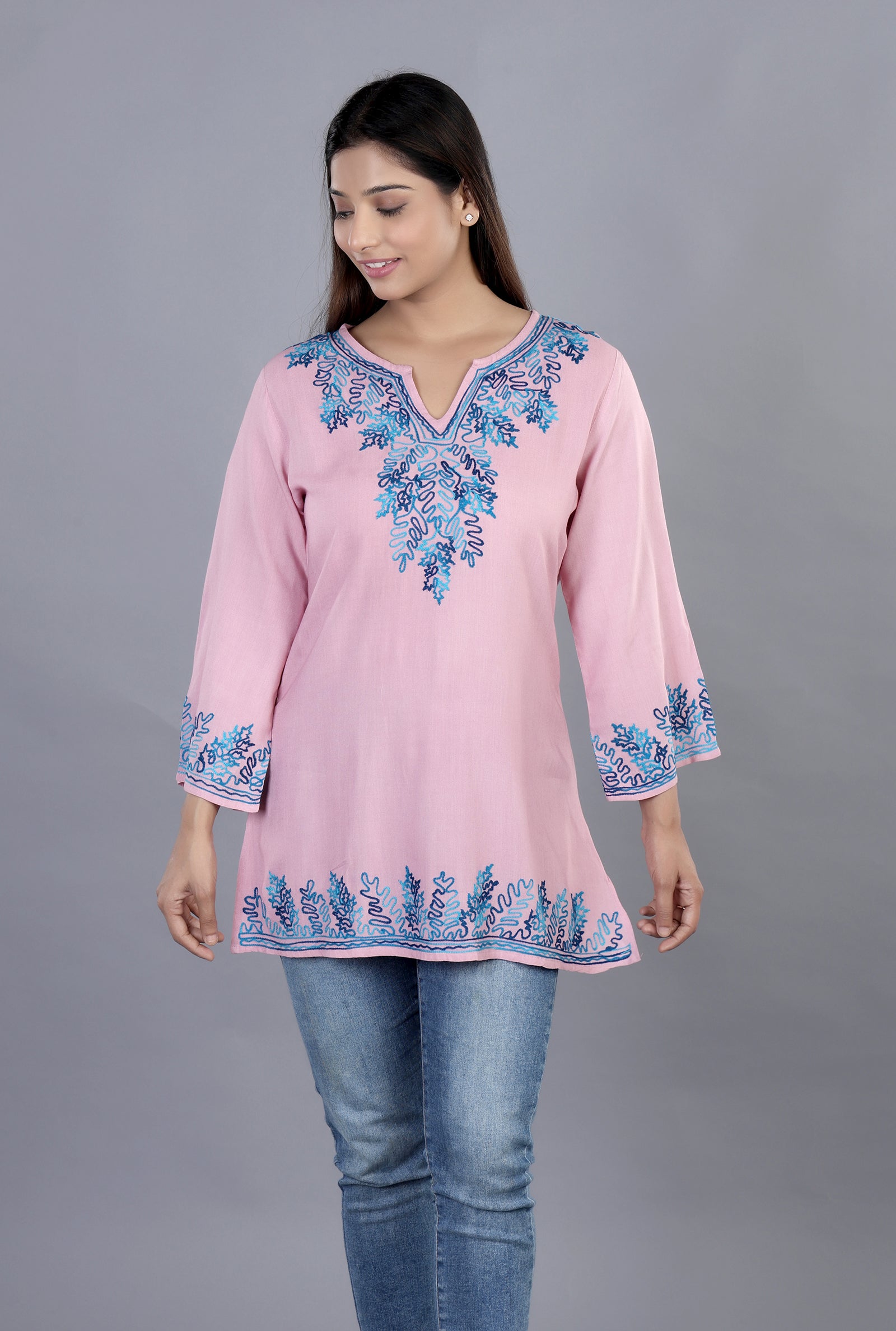 • Pink Embroidered Tunic- Pink can never go wrong regardless of the season. This pink Tunic with blue thread embroidery looks amazingly unique when worn. The string in the middle gives a smart look to it.