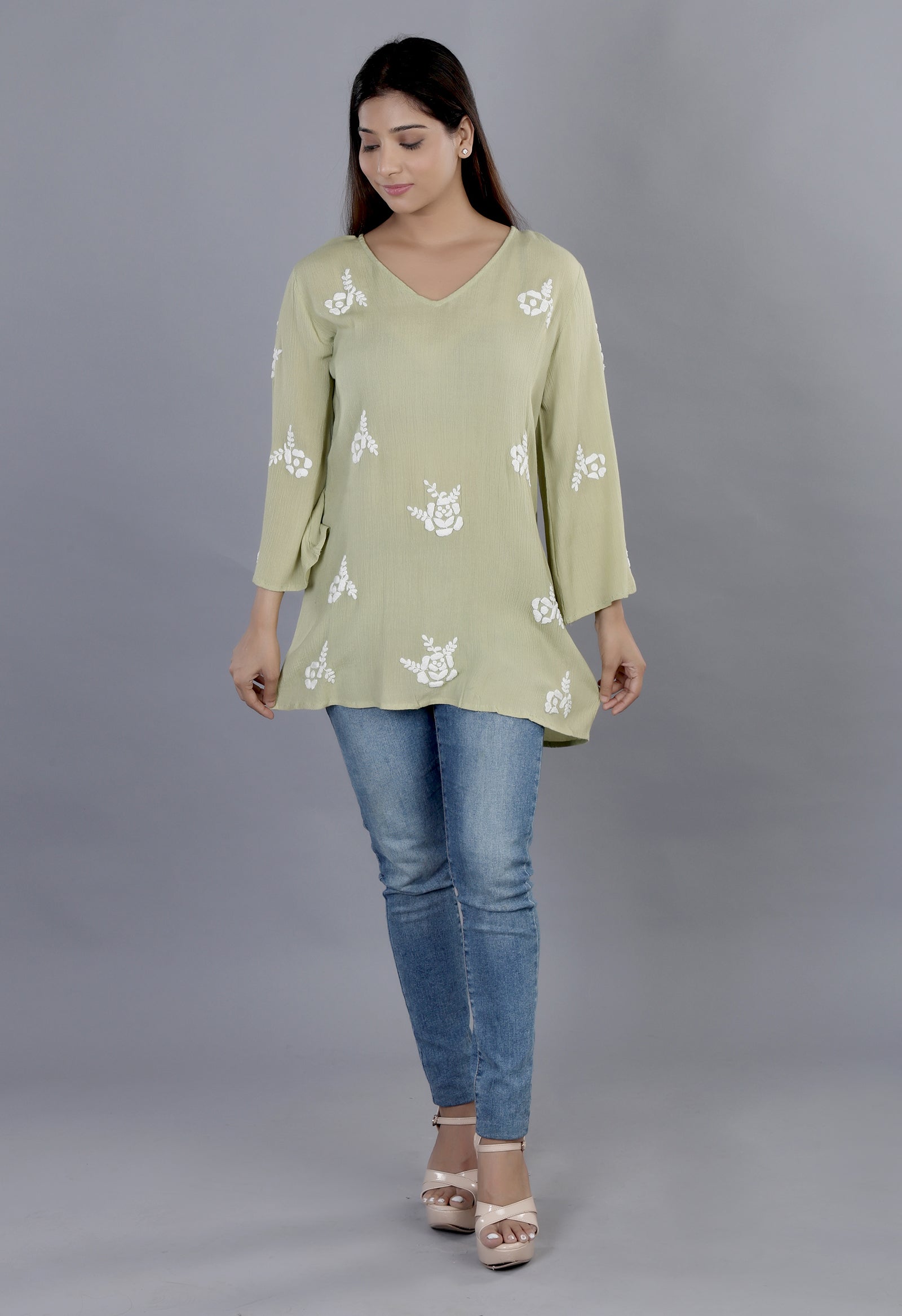 • Sage Green Minimal Embroidered Tunic- There are very few pieces that bestow comfort and style statement at the same time. This sage green embroidered tunic with minimal white floral embroidery all over looks spectacular. It is a perfect office wear when you have some conference to attend, or work from home scenarios.