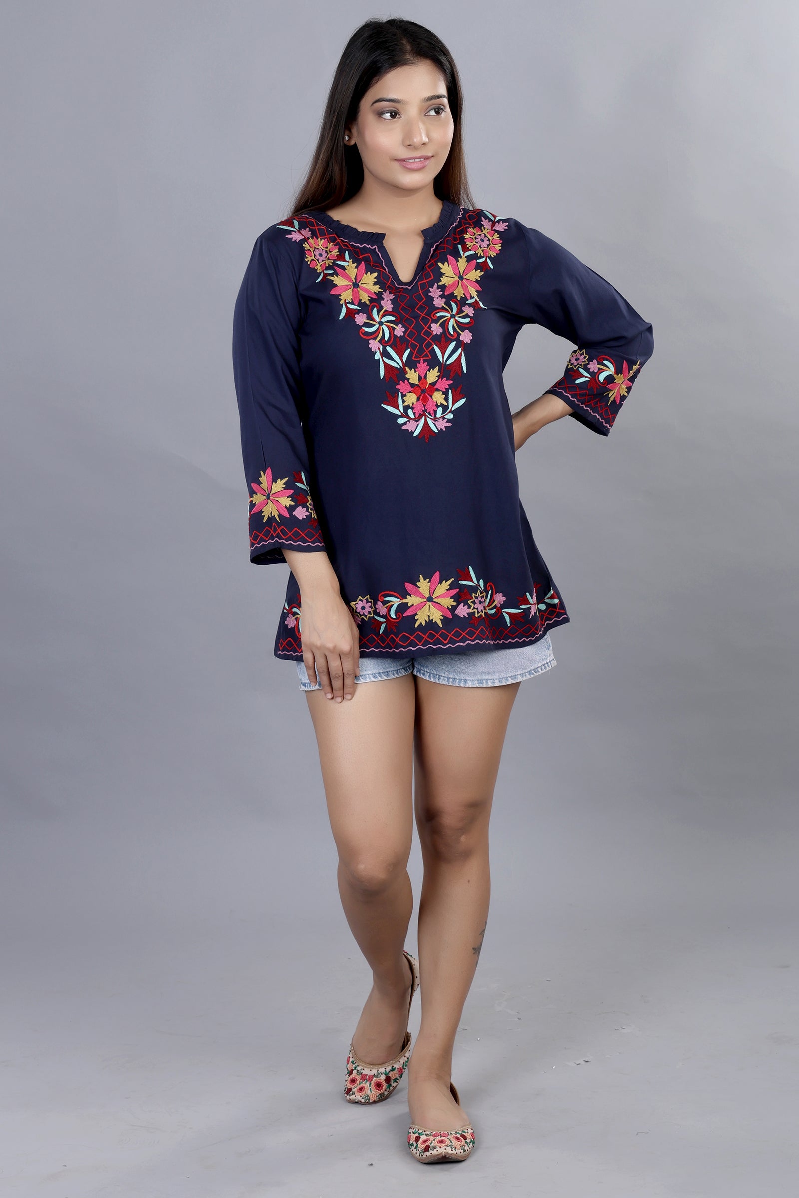 • Royal Blue Embroidered Top- If you prefer dark colors, royal blue can be a great choice. This multicolored thread embroidered royal blue base top is a must have if you are looking for something semi formal. You can carry it everywhere from office to shopping outings.