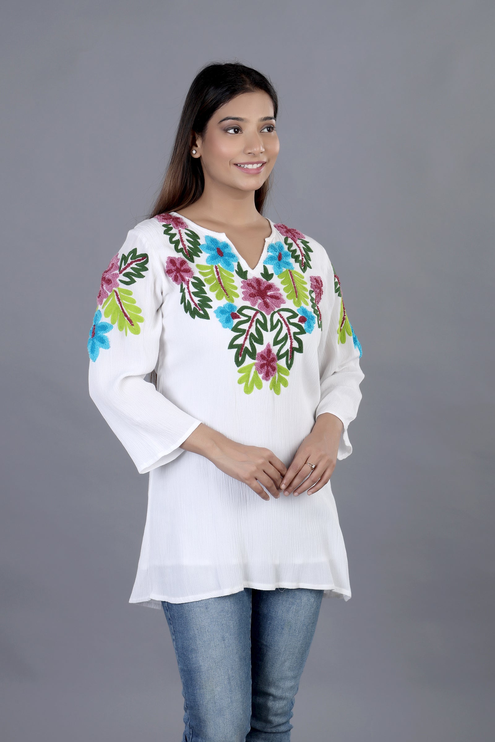 •White Embroidered Tunic- Confused about what to wear in summers? Choose White color chart over anything else. This  White tunic with traditional multihued thread embroidery all over looks amazingly good.  The Broad V neck helps hiding your flaws effortlessly.
