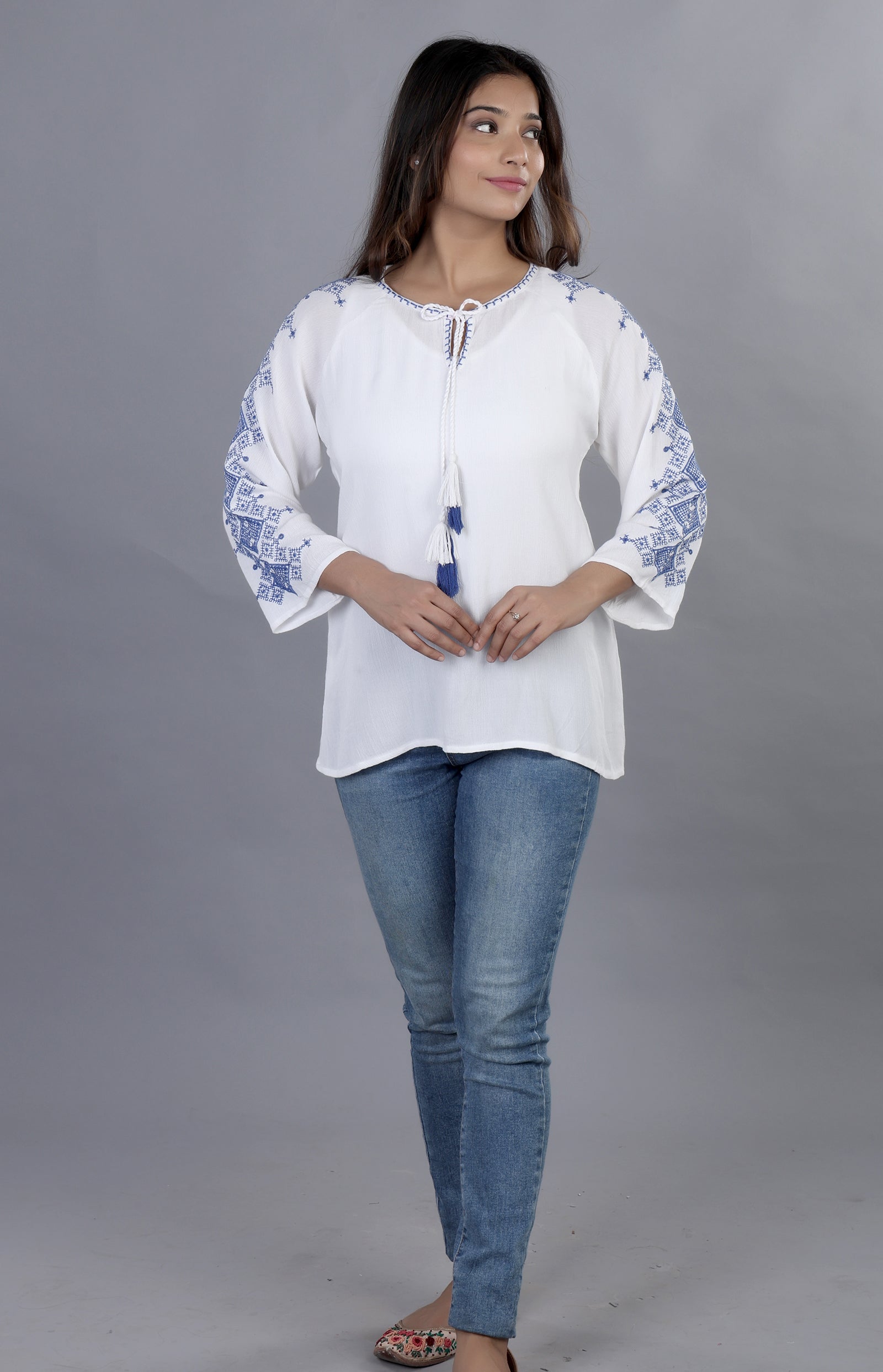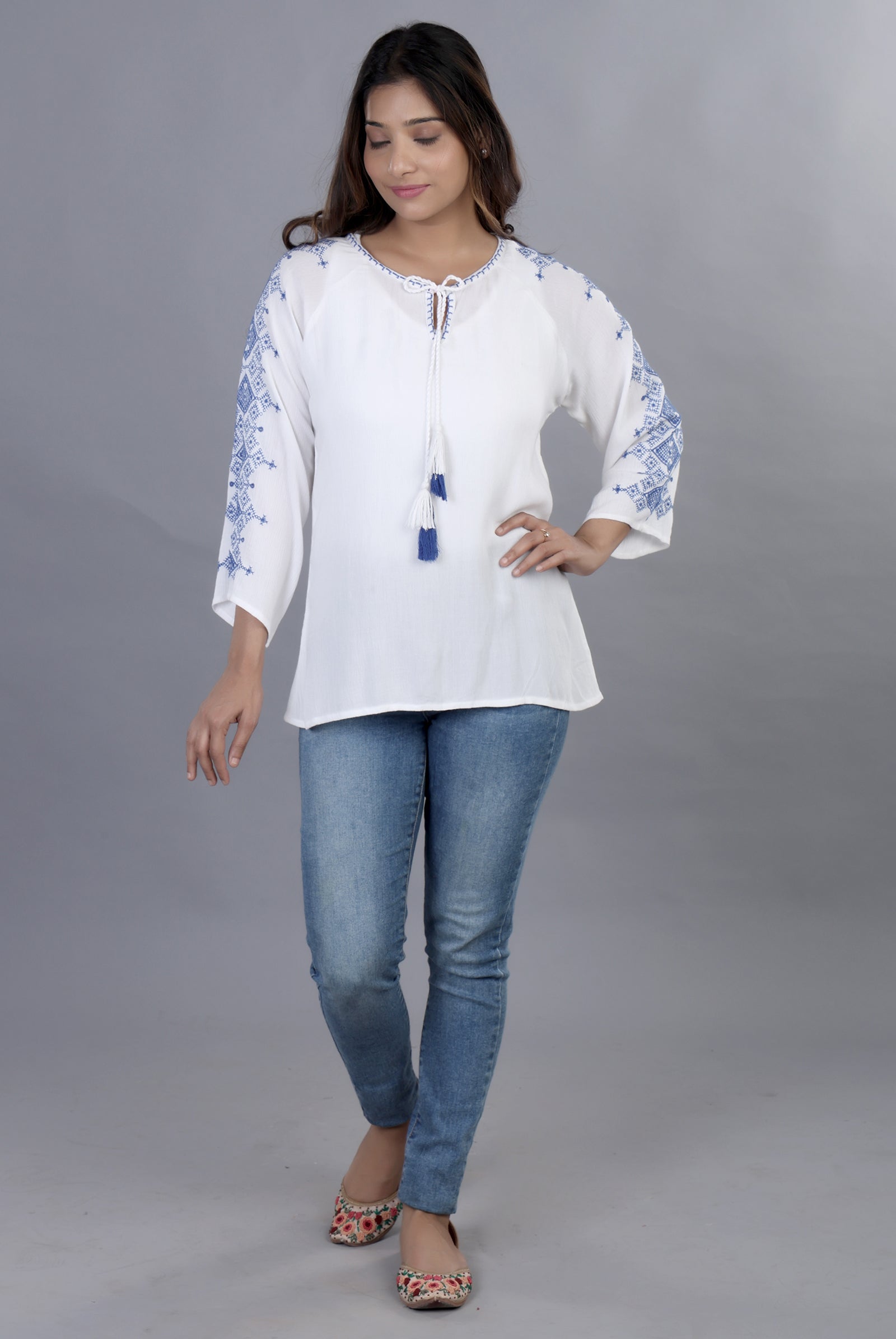 •  Minimal Embroidered White Top- The piece is a perfect choice for those who prefer simple and subtle look. Giving a sense of serenity and versatility, it’s a good wear to office or on vacations as well.