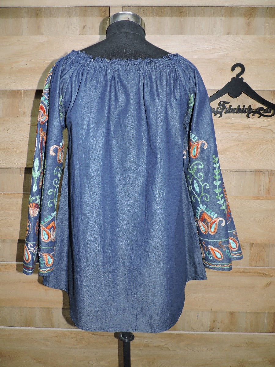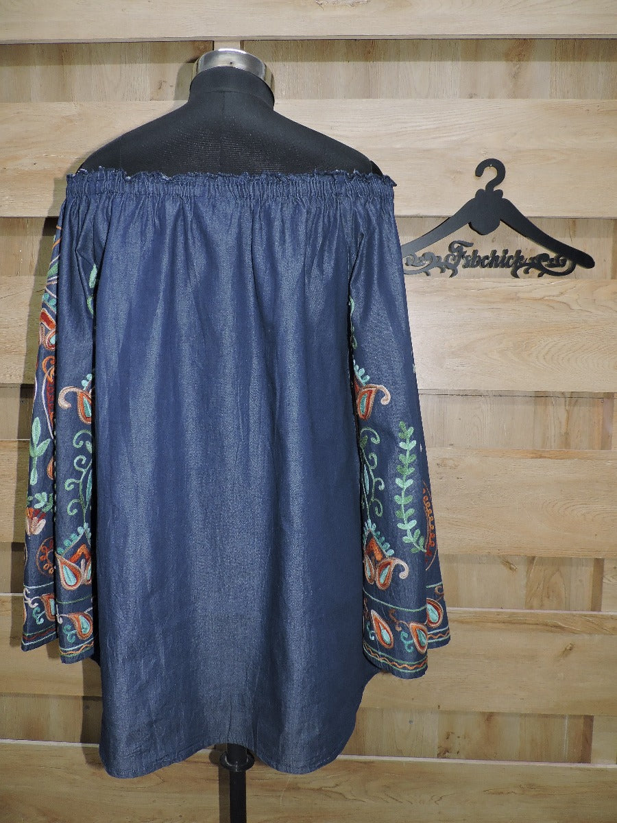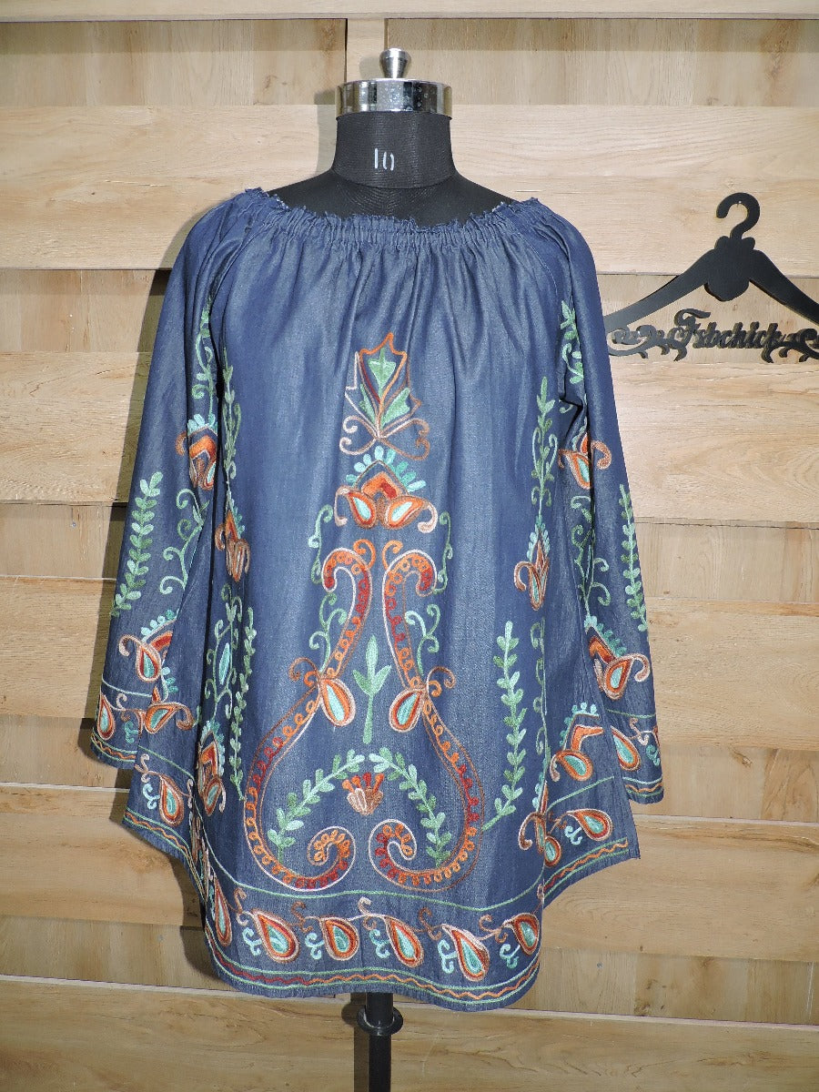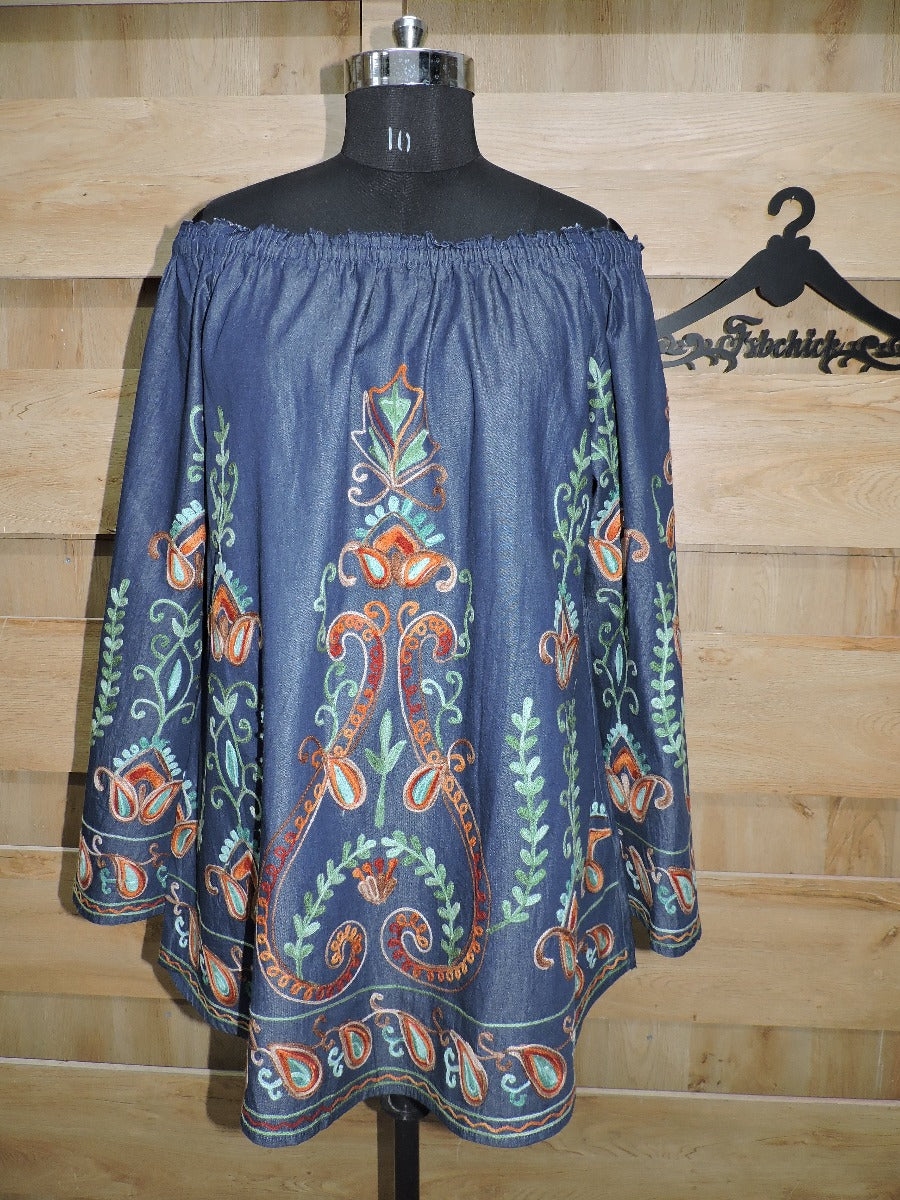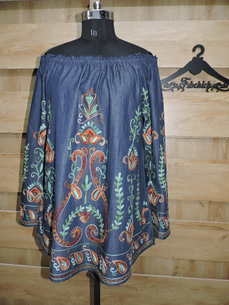 An off shoulder loose fitting top with intricate embroidered patterns of catchy colours. A good addition to your wardrobe for a sunny lunch date or any other casual outing. Pair it with jeans,leggings or even white shorts but don?t forget to use the beautiful neckline by wearing a beautiful necklace!