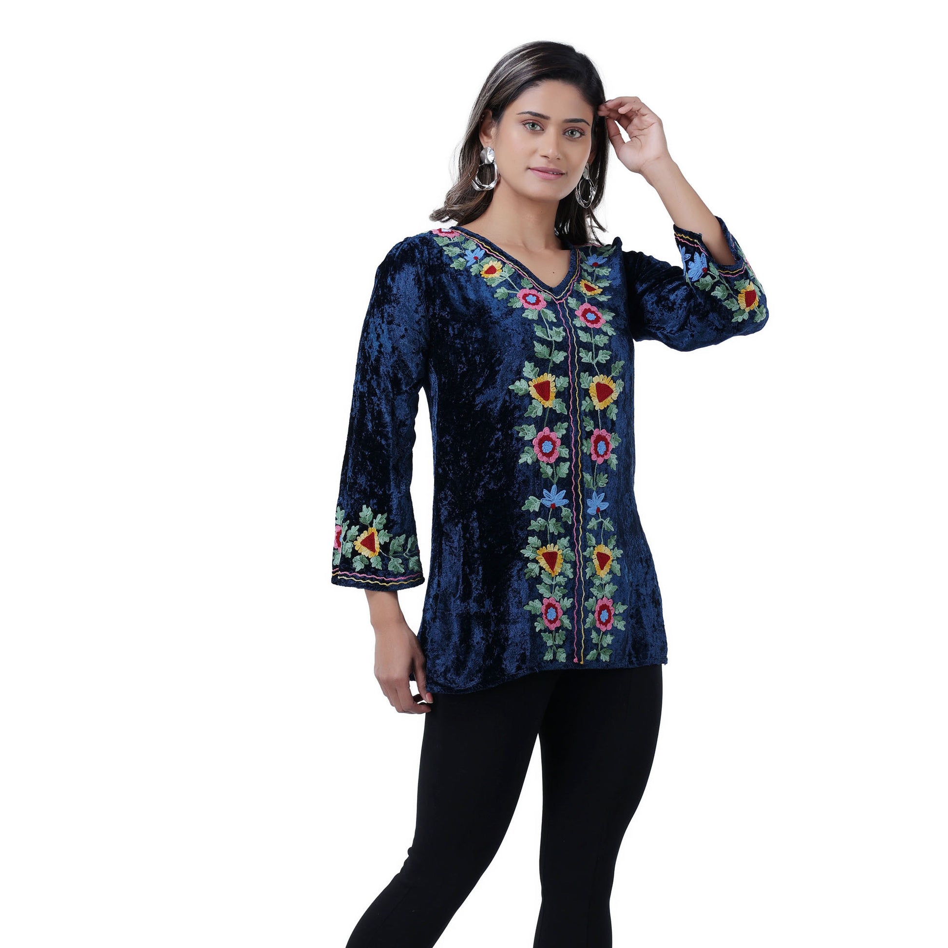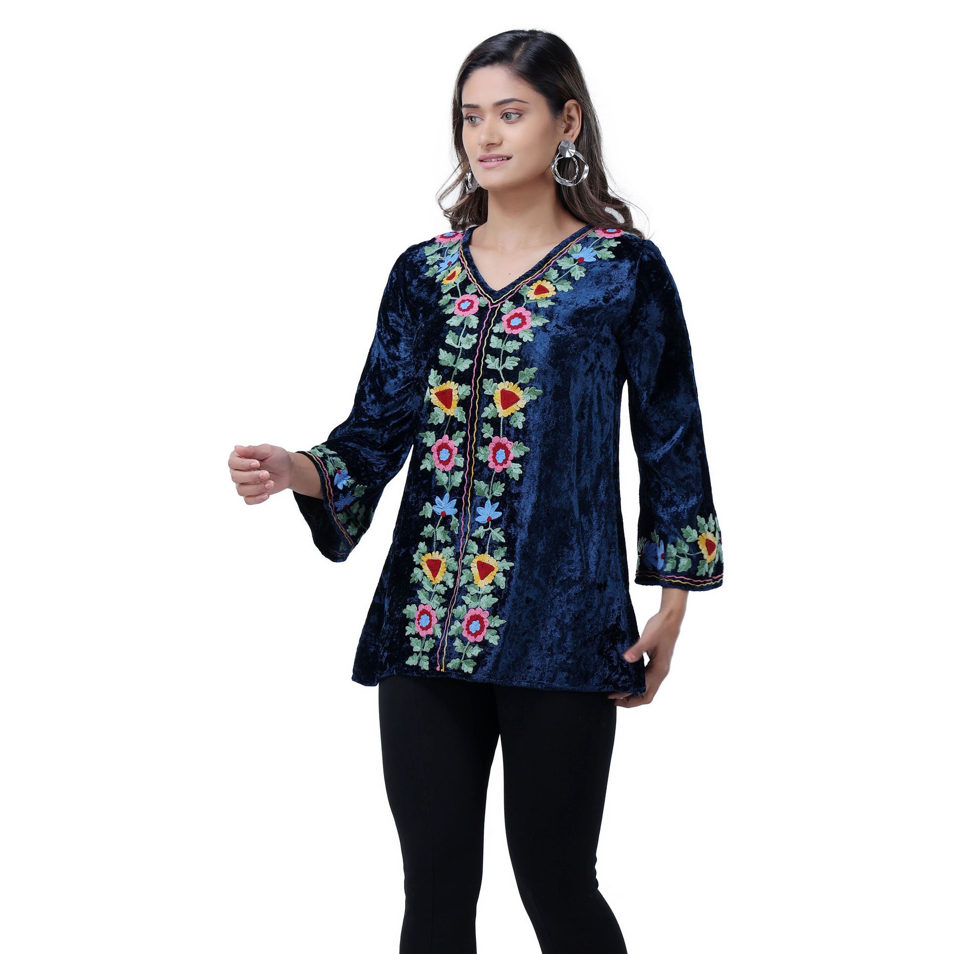 Don't follow trends, be the one people look for. And whatever you carry, have conviction and the belief you desire to have. Also, this is what FSB's collection believes in. Every piece brings out a beautiful story, and this teal blue velvet tunic conveys emotions. The classy v neck and quarter sleeves are merged well to bestow a complete look. Its heavy embroidered pattern ditches the bland look and lets people be aware that simple can stand out if dressed up well. It can be a good addition to your wardrobe; the fabric is breathable, cozy and soft.