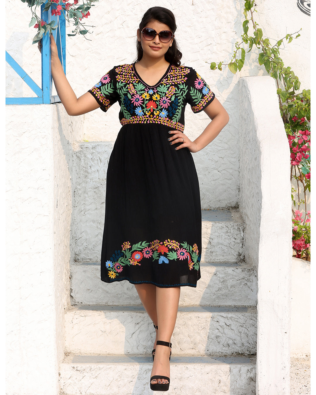 Looking modern yet traditional can be tiring sometimes, especially when there is a dearth of such pieces in the market. This rayon crepe dress carries beautiful floral detailing pattern on the neck and bottom. The 100 % cotton lining inside gives a soft feeling and hence protects you from direct heat. The flowy look appears to be perfect on any body-shape effortlessly.